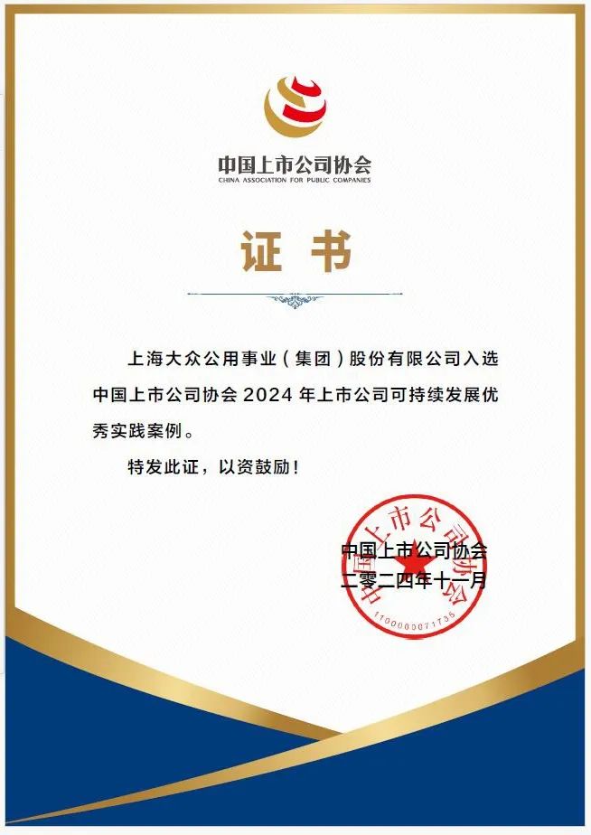 日前,由中国上市公司协会主办的“2024上市公司可持续发展大会”在北京召开。会上,中国上市公司协会发布了2024上市公司可持续发展实践案例评选结果,大众公用凭借在可持续发展领域的优秀表现,获评“2024上市公司可持续发展优秀实践案例”。
