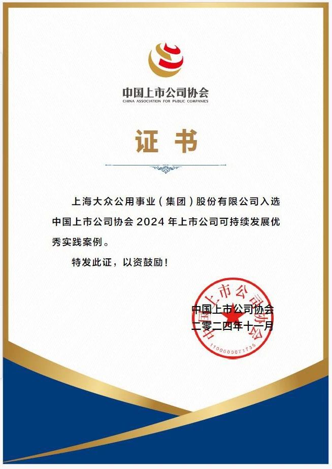 日前,由中国上市公司协会主办的“2024上市公司可持续发展大会”在北京召开。会上发布了2024年度上市公司可持续发展实践案例评选结果,大众公用获评“2024上市公司可持续发展优秀实践案例”。
