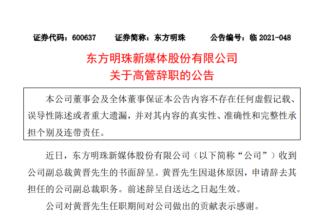 近日,东方明珠相继发布《关于高管辞职的公告》以及《第九届董事会第二十一次(临时)会议决议公告》。公告显示,近日东方明珠收到公司副总裁黄晋的书面辞呈。黄晋因退休原因,申请辞去其担任的公司副总裁职务。