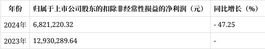 归属于上市公司股东的扣除非经常性损益的净利润为6,821,220.32元,与2023年的12,930,289.64元相比,大幅下降47.25%。这表明公司核心业务的盈利能力面临挑战,可能受到市场竞争、成本上升等多种因素的影响。投资者在关注公司业绩时,应更加重视扣非净利润这一指标,以评估公司主营业务的真实盈利水平。