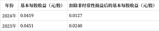 基本每股收益为0.0419元/股,较2023年的0.0451元/股下降7.11%;扣除非经常性损益后的基本每股收益为0.0127元/股,与2023年的0.0240元/股相比,下降47.25%。这与净利润和扣非净利润的变动趋势一致,反映了公司盈利能力的下滑对股东收益的影响。