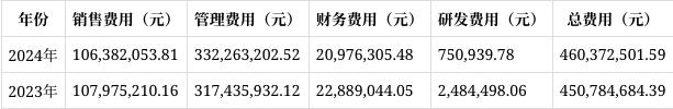 2024年公司总费用(销售费用+管理费用+财务费用+研发费用)为460,372,501.59元,2023年为450,784,684.39元,同比增长2.13%。各项费用呈现出不同的变化趋势。