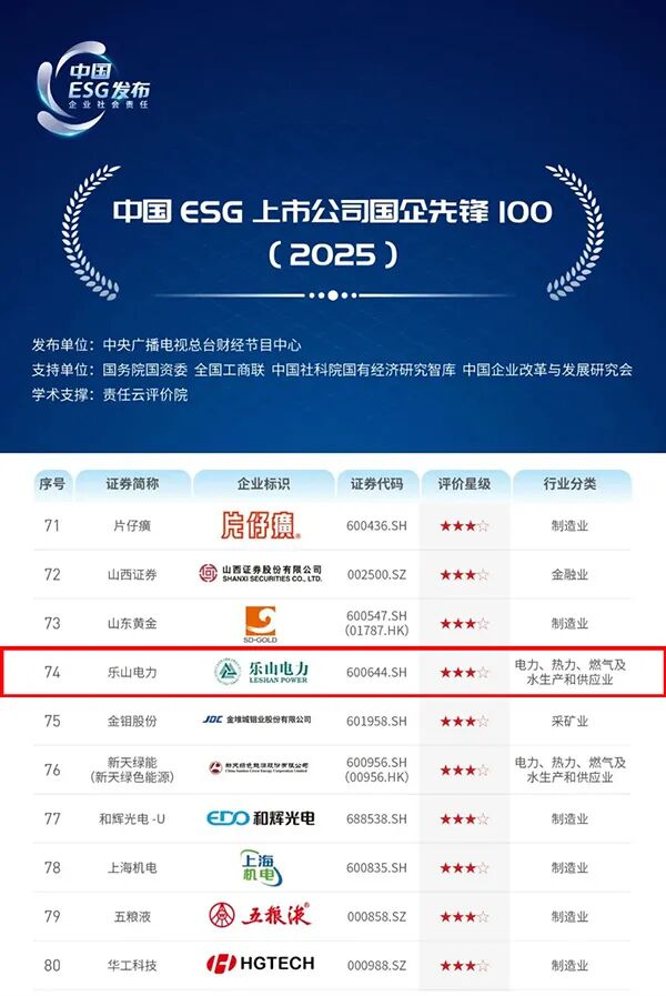 近日,ESG中国·创新年会(2025)暨首届ESG国际博览会在北京召开,中央广播电视总台发布《2025年度ESG行动报告》,公司成功入选“中国ESG上市公司国企先锋100”榜单。