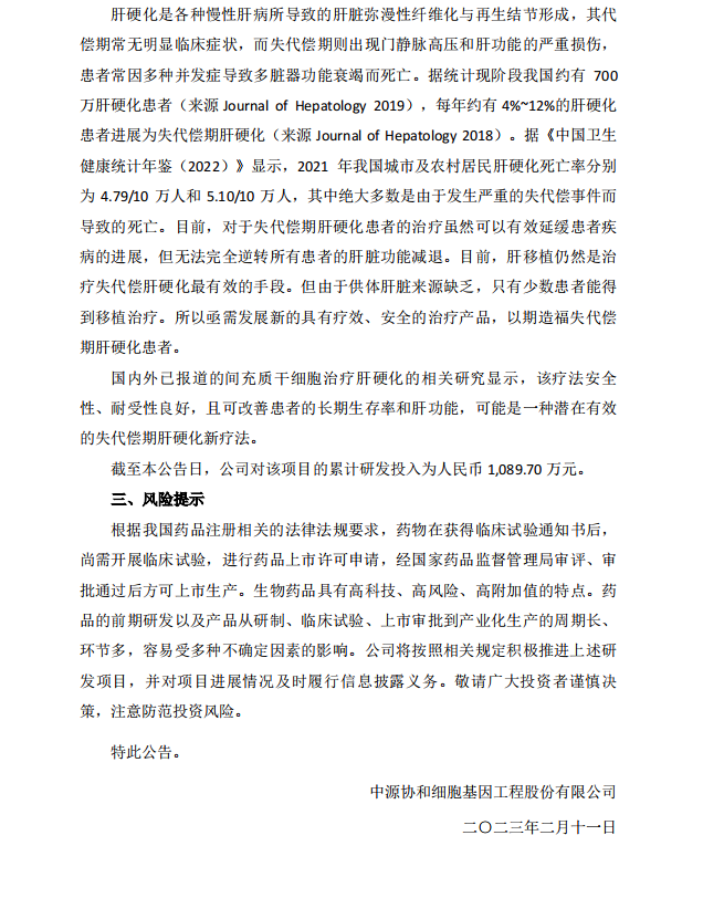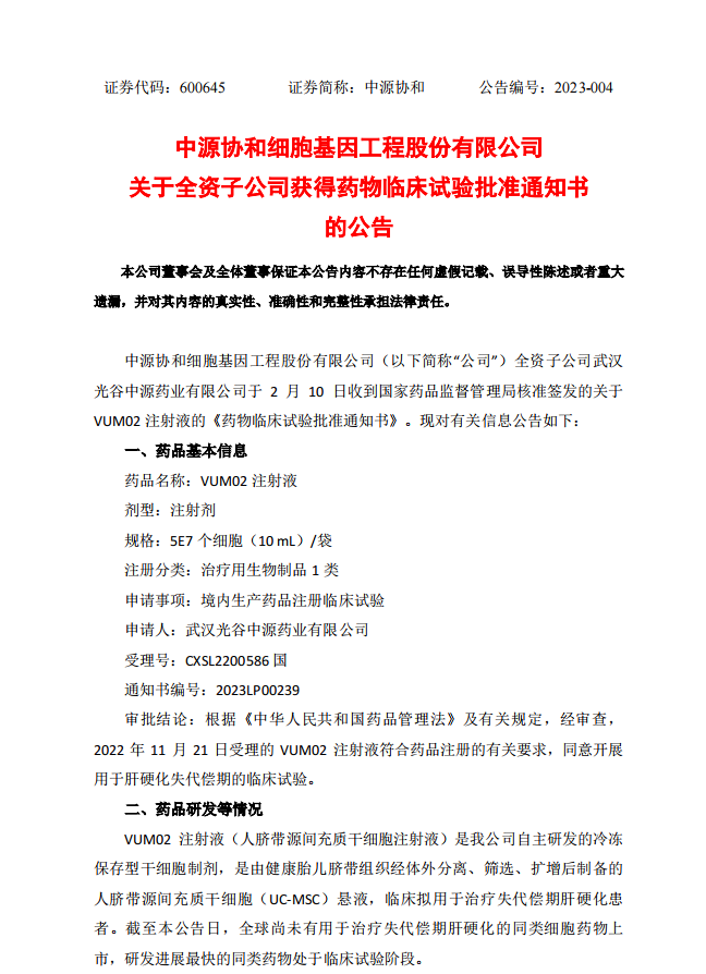 中源协和细胞基因工程股份有限公司(以下简称“公司”)全资子公司武汉光谷中源药业有限公司于2023年 2 月 10 日收到国家药品监督管理局核准签发的关于VUM02 注射液的《药物临床试验批准通知书》。现对有关信息公告如下:
