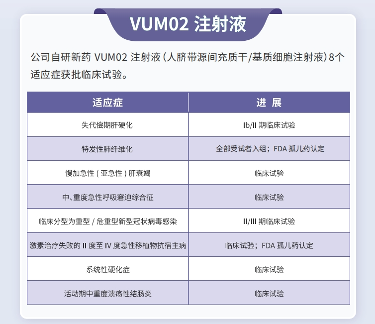 近年来,中源协和在创新研发与干细胞药物申报方面取得临床突破,领跑干细胞新药赛道。公司自主研发的 VUM02 注射液(人脐带源间充质干细胞注射液)8个适应症收到国家药品监督管理局核准签发的《药物临床试验批准通知书》。VUM02 注射液适应症及进展: