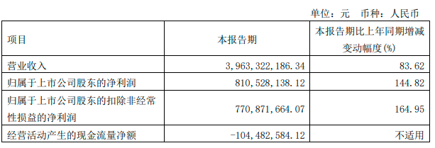 公告显示,2022年第一季度公司营业收入39.63亿元,同比增长83.62%;归属于上市公司股东的净利润8.11亿元,同比增长144.82%;归属于上市公司股东的扣除非经常性损益后的净利润7.71亿元,同比增长164.95%;基本每股收益0.71元,同比增长144.82%。