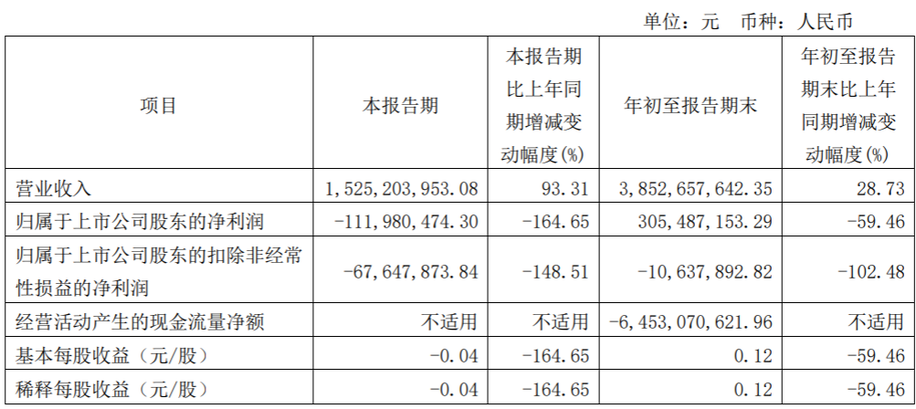 报告期内,公司第三季度实现营业收入15.25亿元,同比增长93.31%;归属于上市公司股东的净利润为-1.12亿元,同比下降164.65%。