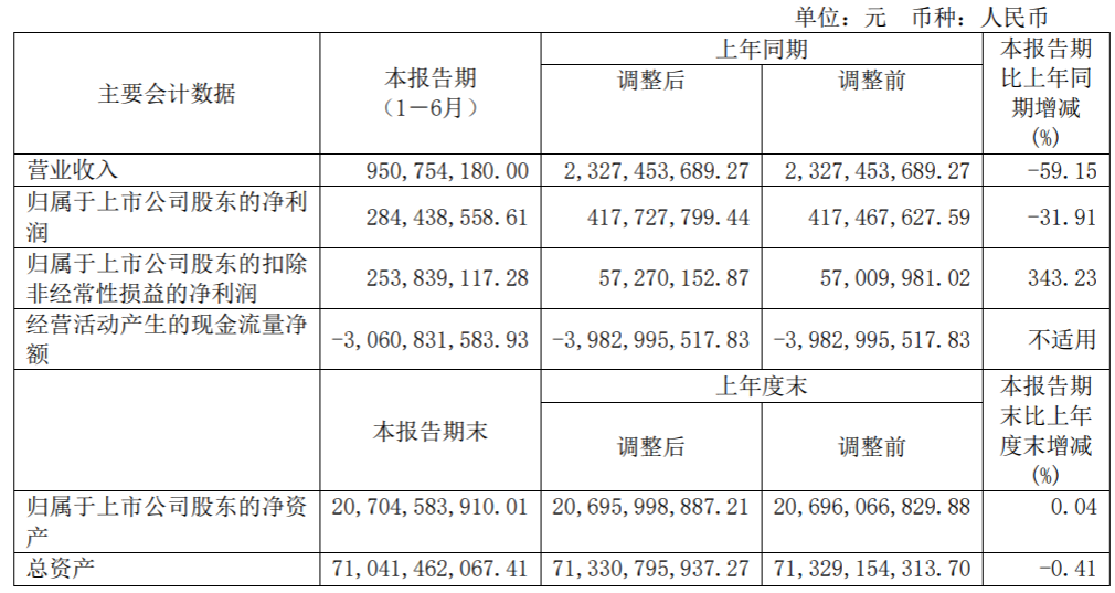 2023年上半年,公司实现营业收入为9.51亿元,同比下降59.15%;归属于上市公司股东的净利润为2.84亿元,同比下降31.91%。报告期内,公司经营活动产生的现金流量净额为-30.61亿元。