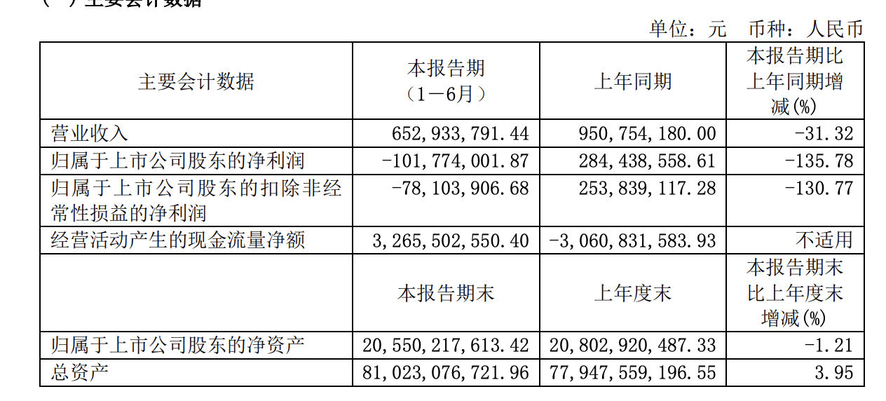 报告期内,城投控股实现营业收入6.53亿元,同比减少31.32%;归属于上市公司股东的净亏损1.02亿元,同比由盈转亏;经营活动产生的现金流量净额32.66亿元,同比由负转正。