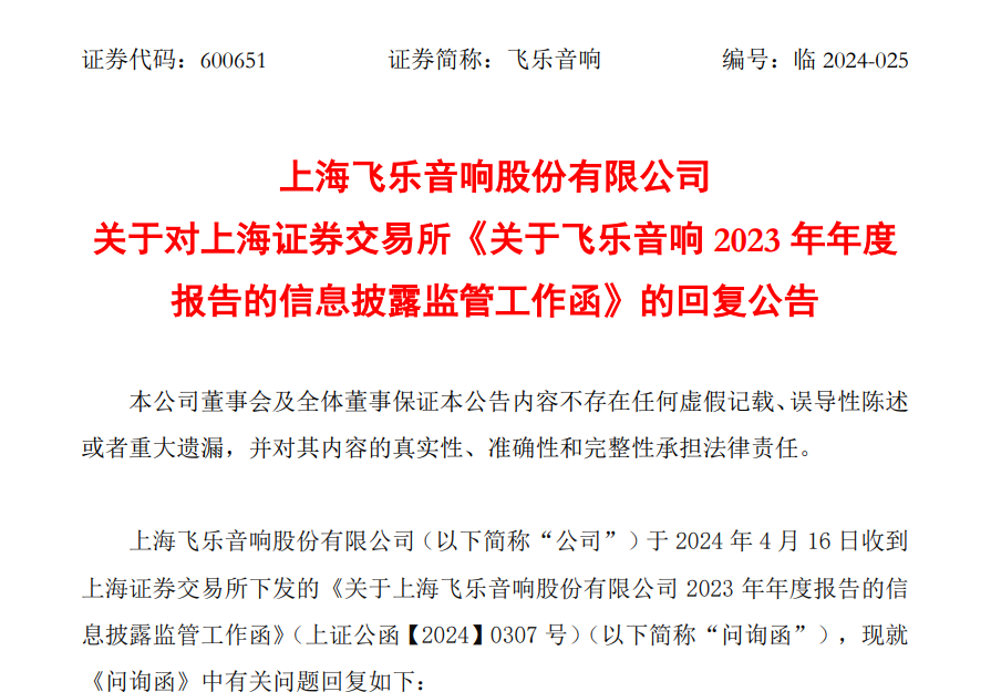 5月30日,飞乐音响(600651.SH)回复年报问询,涉及扣非归母净利、货币资金等问题。