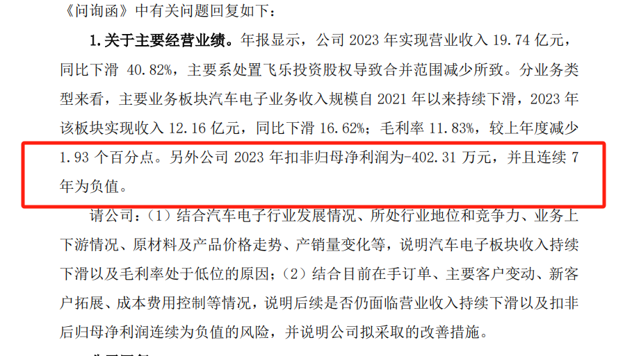 据此,飞乐音响被要求说明后续是否仍面临营业收入持续下滑以及扣非后归母净利润连续为负值的风险,并说明拟采取的改善措施。