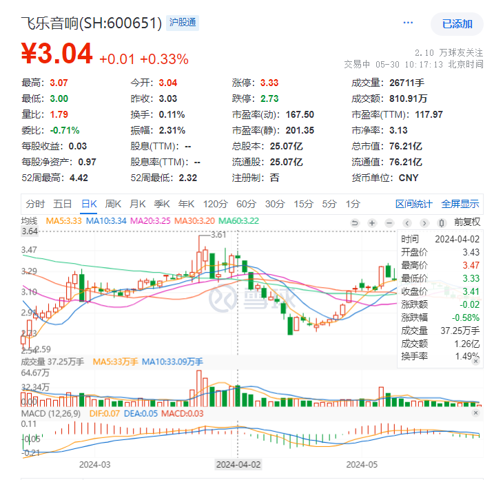 截至5月30日10:17,飞乐音响股价涨0.33%,报3.04元,总市值为76.21亿元。