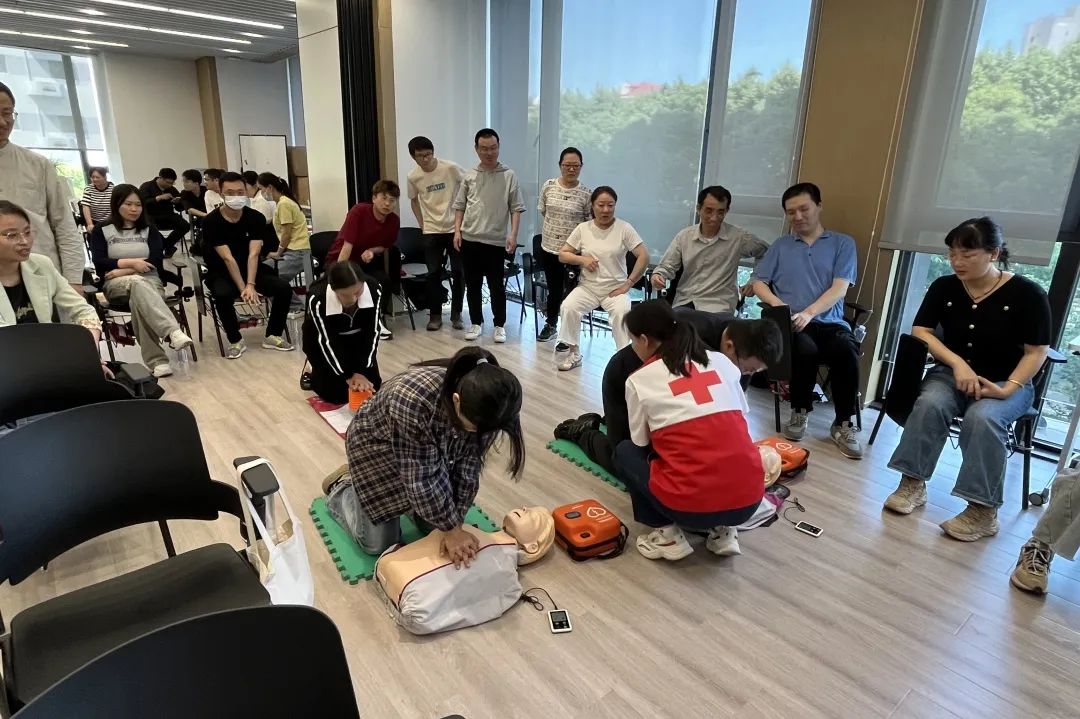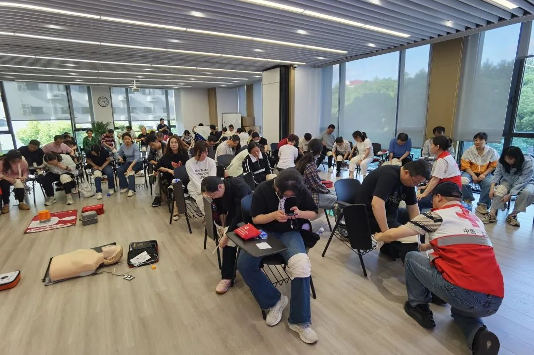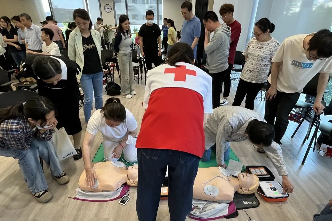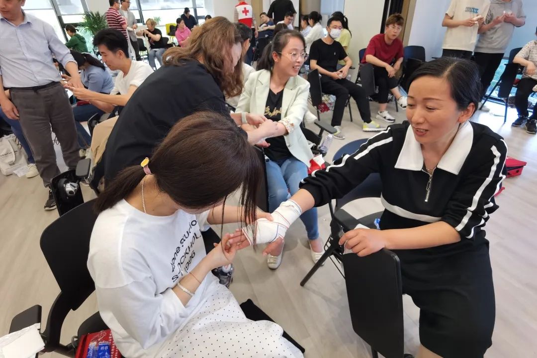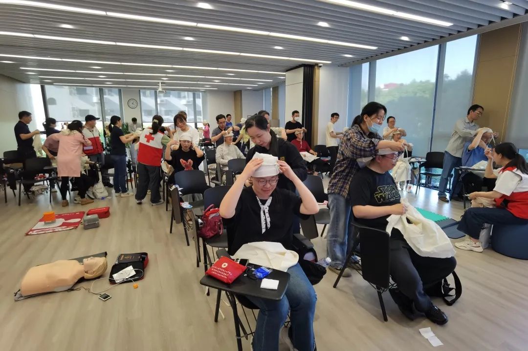 此次培训包含线上理论考试及线下操作考核。学员们通过线上学习红十字运动与救护概论、心肺复苏、自动体外除颤、气道异物梗阻处理、创伤救护等课程。在3个小时的线下课程中,50位职工分别进行了心肺复苏(CPR+AED)实操,外出血的止血与包扎实操等考核内容,顺利获得了救护员(初级)电子证书。