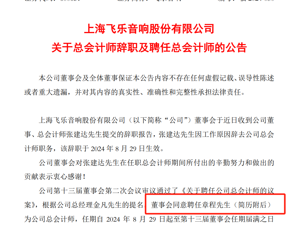 今年8月29日,张建达因工作原因辞去公司总会计师职务,章程接任。