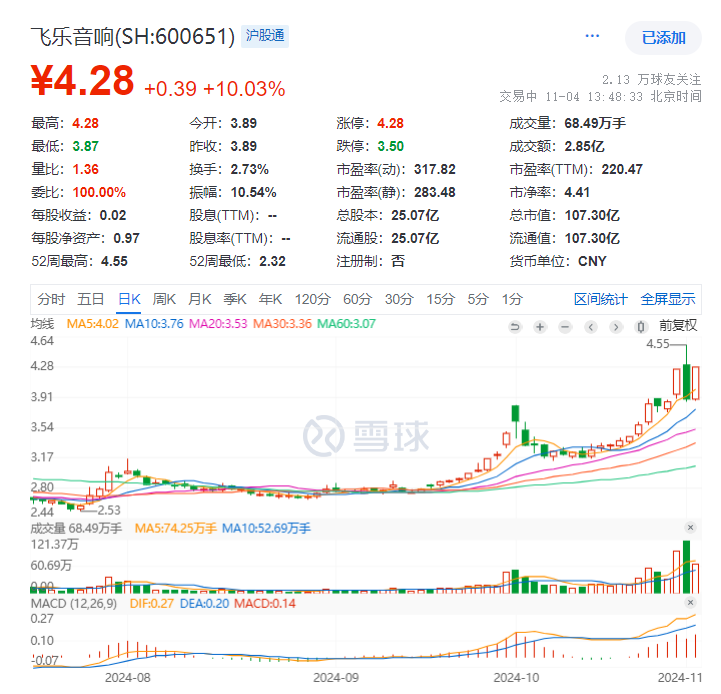 乐居财经李兰 11月4日,截至13:48,飞乐音响(600651.SH)股价涨10.03%,报4.28元/股,总市值为107.3亿元。