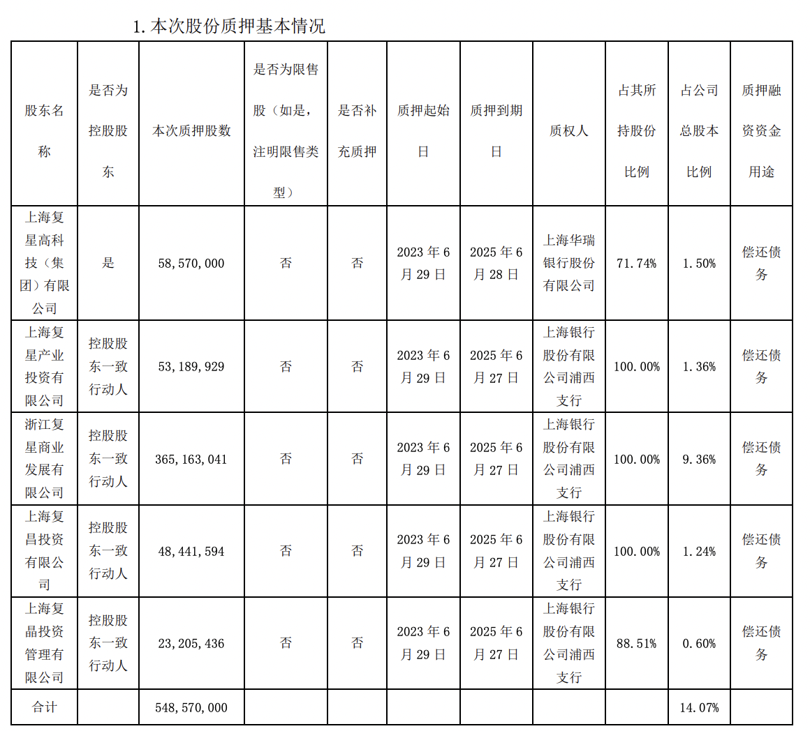 公告显示,豫园股份控股股东上海复星高科技(集团)有限公司(以下简称“复星高科技”)及其下属上海复星产业投资有限公司、浙江复星商业发展有限公司、上海复昌投资有限公司、上海复晶投资管理有限公司(以下简称“复星产投”、“复星商业”、“复昌投资”、“复晶投资”)将所持有豫园股份的548,570,000股股份办理质押手续,占公司总股本比例14.07%。