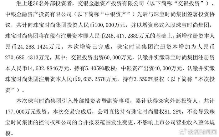 至2024年11月,已有36名外部投资者与珠宝时尚集团签署了投资协议,同意对合伙平台菏泽珠盈企业管理合伙企业(有限合伙)出资,再通过合伙平台对珠宝时尚集团增资的形式入股珠宝时尚集团。加上近日的交银投资和中银资产,珠宝时尚集团累计获得了38家外部投资人、共计17.70亿元投资。