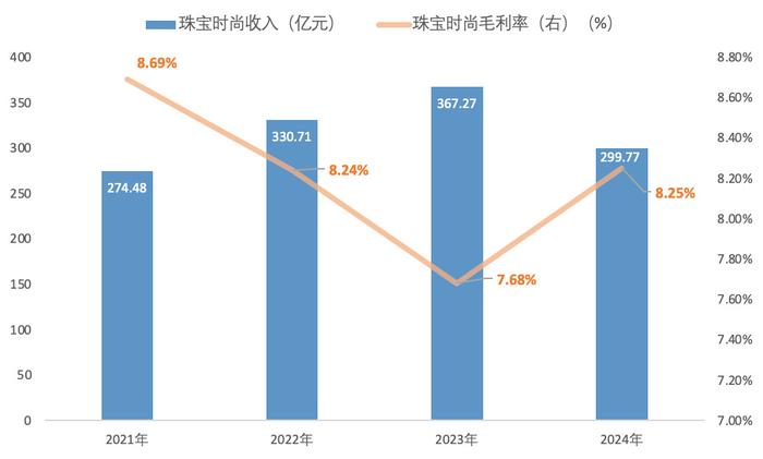 据财报数据披露,2022年至2024年,珠宝时尚板块收入已占到豫园股份各年总营收的六成以上,但这一收入支柱的经营表现却渐显低迷态势。2022年和2023年,珠宝时尚业务毛利率连续下跌,同比分别减少0.45和0.56个百分点,至2024年虽回升至8.25%,但仍不及2021年同期数值(8.69%)。2024年,珠宝时尚的收入也同比下降18.38%至299.77亿元。