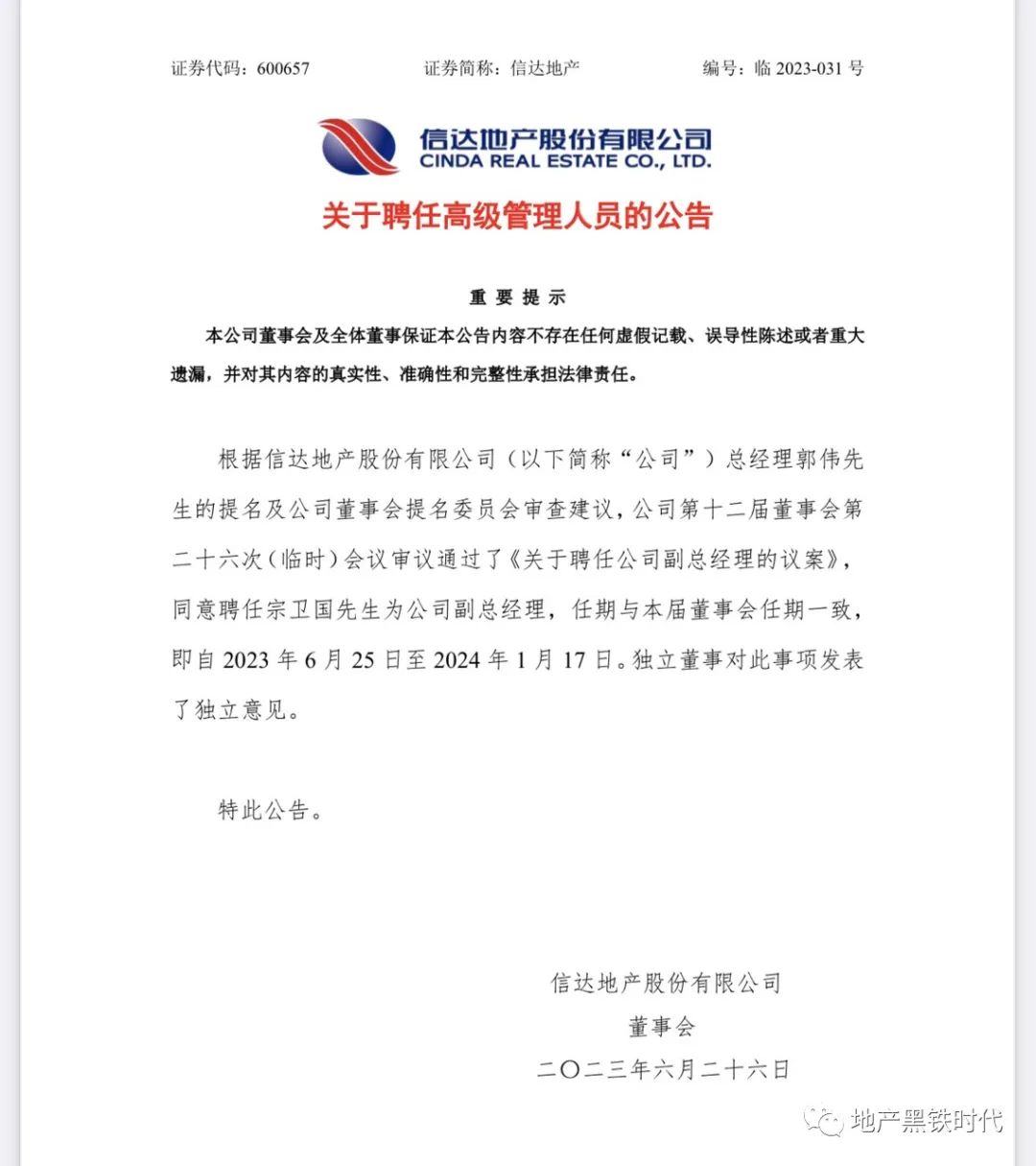 信达地产(SH600657)公告称,同意聘任宗卫国为公司副总经理,任期与本届董事会任期一致,即自2023年6月25日至2024年1月17日。