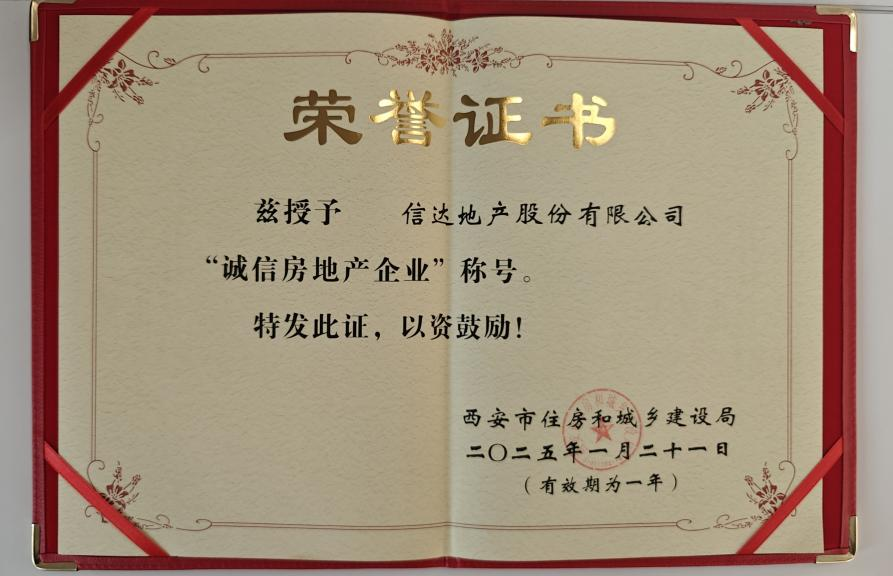 3月10日,信达地产凭借突出的市场表现、履约能力及社会贡献,从百余家房地产开发企业中脱颖而出,荣获西安市住房和城乡建设局颁发的2024年度“房地产开发诚信企业”称号。荣誉的获得既是对信达地产进入西安市场以来工作的认可,也是对公司多年来坚守以诚信立业的肯定。