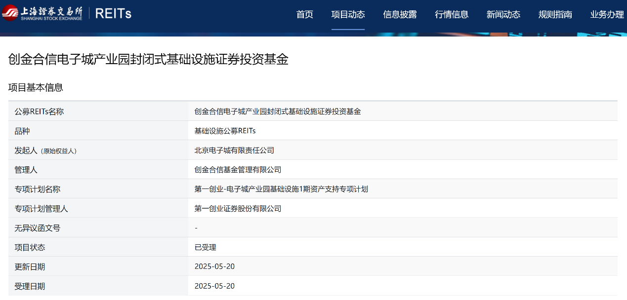 5月21日晚,电子城发布公告称,创金合信电子城产业园REIT项目相关材料已于5月20日获中国证监会和上海证券交易所正式受理,项目发起人为北京电子城高科技集团股份有限公司(简称“电子城”),原始权益人为电子城旗下资管平台北京电子城有限责任公司(简称“电子城有限”)。项目是朝阳区首单公募REITs项目,也是北京市属企业又一单获正式受理的首次发行项目,丰富了REITs市场的资产供给。