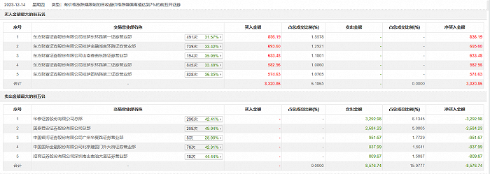 12月14日,昂立教育今日跌停,全天换手率达14.71%,振幅达6.81%。龙虎榜数据显示,营业部席位合计净卖出5255.87万元。其中,华泰证券总部、国泰君安证券总部分别卖出3292.98万元、2684.23万元;东方财富证券拉萨东环路第一证券营业部、东方财富证券拉萨金融城南环路证券营业部分别买入836.19万元、693.60万元。