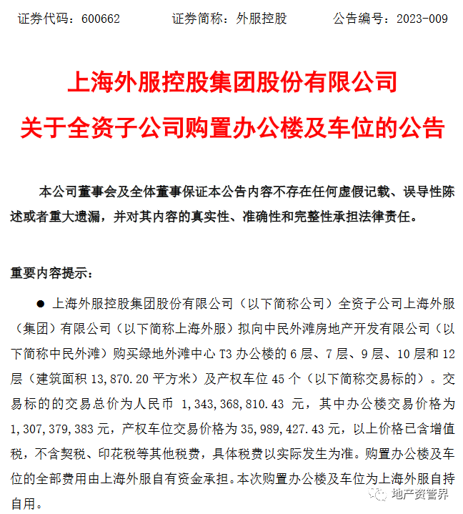 据公告披露,上海外服控股集团全资子公司上海外服(集团)有限公司拟向中民外滩房地产开发有限公司购买绿地外滩中心 T3 办公楼的 6 层、7 层、9 层、10 层和 12层(建筑面积 13,870.20 平方米)及产权车位 45 个(以下简称交易标的)。交易标的的交易总价为人民币 1,343,368,810.43 元,其中办公楼交易价格为1,307,379,383元,产权车位交易价格为 35,989,427.43 元,以上价格已含增值税,不含契税、印花税等其他税费,具体税费以实际发生为准。购置办公楼及车位的全部费用由上海外服自有资金承担。本次购置办公楼及车位为上海外服自持自用。
