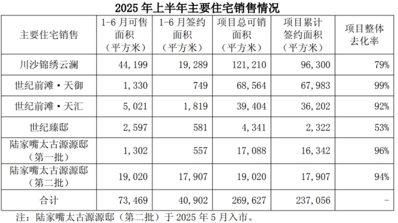 根据财报,今年上半年,陆家嘴实现房产销售现金流入合计61.87亿元。从收入主要来源看,住宅物业(含车位)销售现金流入55.48亿元,主要为世纪前滩·天御、世纪前滩·天汇、川沙锦绣云澜、世纪臻邸、陆家嘴太古源源邸第一批及第二批。2025年上半年,其累计住宅物业合同销售面积4.10万平方米,同比增加96%;合同销售金额47.69亿元,同比增加111%;在售项目的整体去化率为91%。