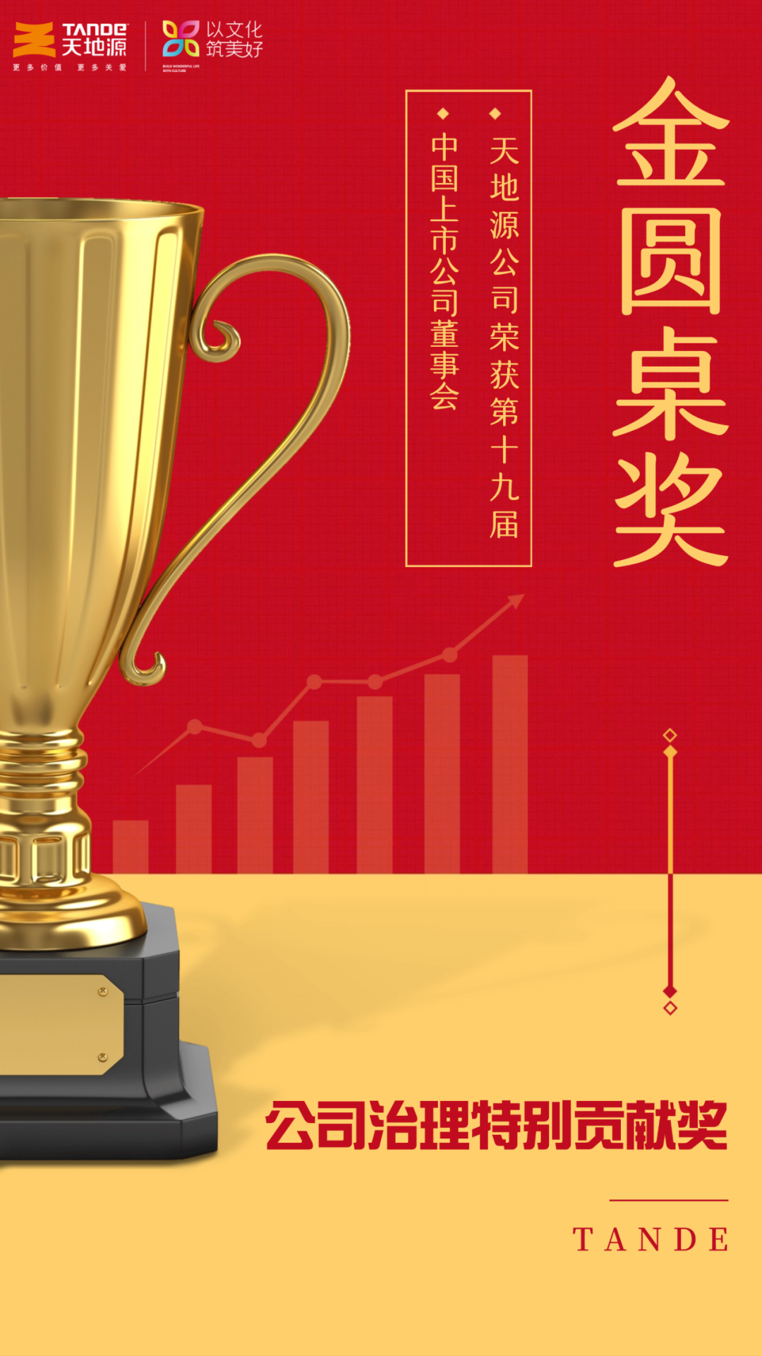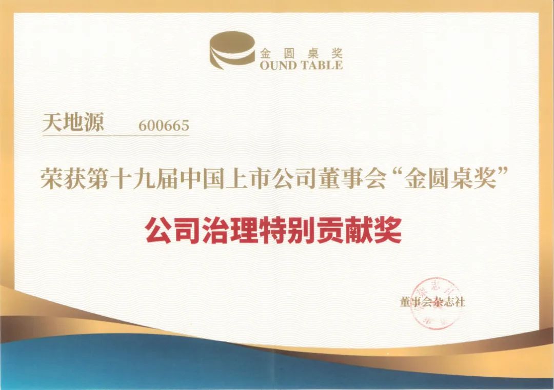近日,第十九届中国上市公司董事会“金圆桌奖”正式颁布,天地源公司凭借在公司治理、规范运作等方面的良好表现,斩获“上市公司董事会金圆桌奖——公司治理特别贡献奖”。