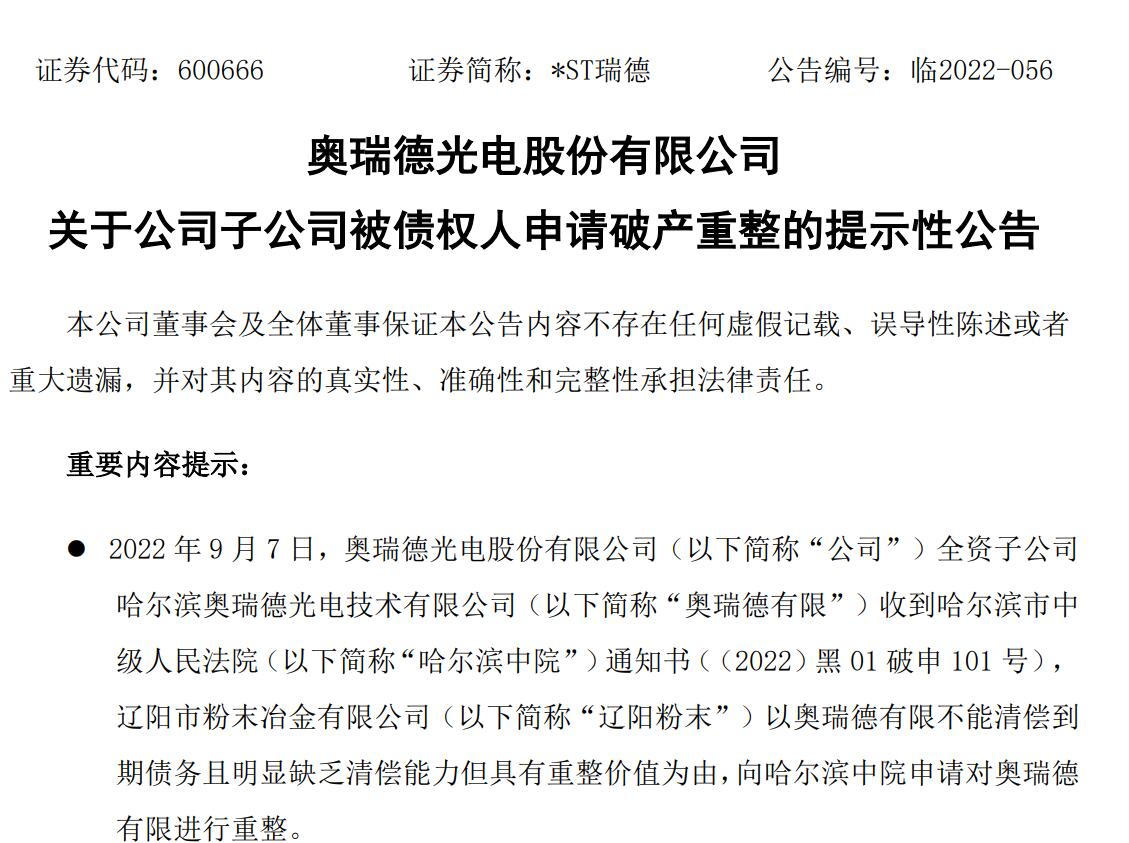 *ST瑞德9月7日晚间公告称,公司全资子公司奥瑞德有限收到哈尔滨中院通知书,辽阳粉末以奥瑞德有限不能清偿到期债务且明显缺乏清偿能力但具有重整价值为由,申请对奥瑞德有限进行重整。