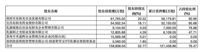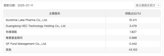 据7月11日更新数据,东阳光长江药业主要股东及持股比例为:东阳光药业有限公司(下称“东阳光药业”)持股51.4%,上市公司东阳光持股2.5%,资管机构先锋领航持股1.8%,维景基金顾问持股0.7%,广发基金0.44%。
