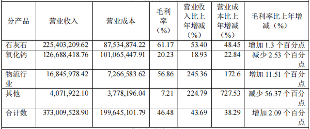 从业务结构来看,“石灰石”是企业营业收入的主要来源。2021年,“石灰石”营业收入为2.3亿,营收占比为60.4%,毛利率为61.2%。