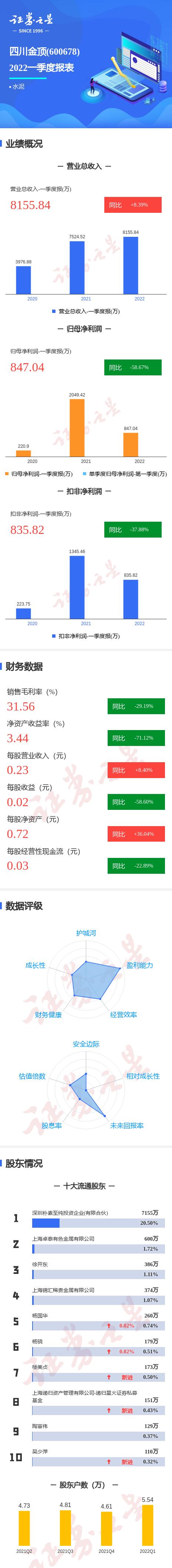 四川金顶2022一季报显示,公司主营收入8155.85万元,同比上升8.39%;归母净利润847.04万元,同比下降58.67%;扣非净利润835.82万元,同比下降37.88%;其中2022年第一季度,公司单季度主营收入8155.85万元,同比上升8.39%;单季度归母净利润847.04万元,同比下降58.67%;单季度扣非净利润835.82万元,同比下降37.88%;负债率56.18%,投资收益-0.62万元,财务费用359.1万元,毛利率31.56%。