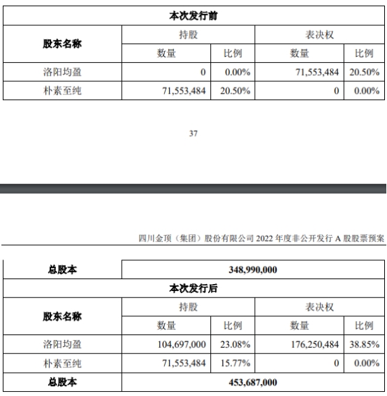 2020年12月21日,朴素至纯与洛阳均盈签订了《表决权委托协议》,将其持有的四川金顶流通股共计71,553,484股股份(占上市公司总股本的20.50%)的表决权(包括因目标公司配股、送股、资本公积转增股本、拆股、股利分红等情形对授权股份数量进行调整后对应的全部表决权)全部无条件委托洛阳均盈行使。《表决权委托协议》生效后,公司的控股股东变更为洛阳均盈,朴素至纯与洛阳均盈形成一致行动关系。