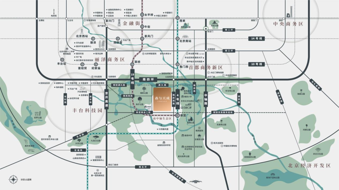 从森与天成坐地铁3站到首都商务新区,5站到金融街,6站到丽泽商务区核心,11站到国贸,去丰台科技园驾车不到20分钟,骑行半小时,都是非常舒适的通勤距离。