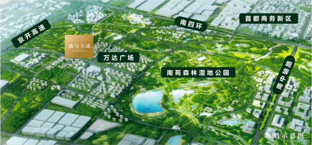 从地图上看,森与天成就像掉进首都绿肺中的一颗明珠。写进北京十三五规划的南苑森林湿地公园定位中轴线上的首都绿肺,相当于2.5个奥森,成为项目天然的生态屏障。