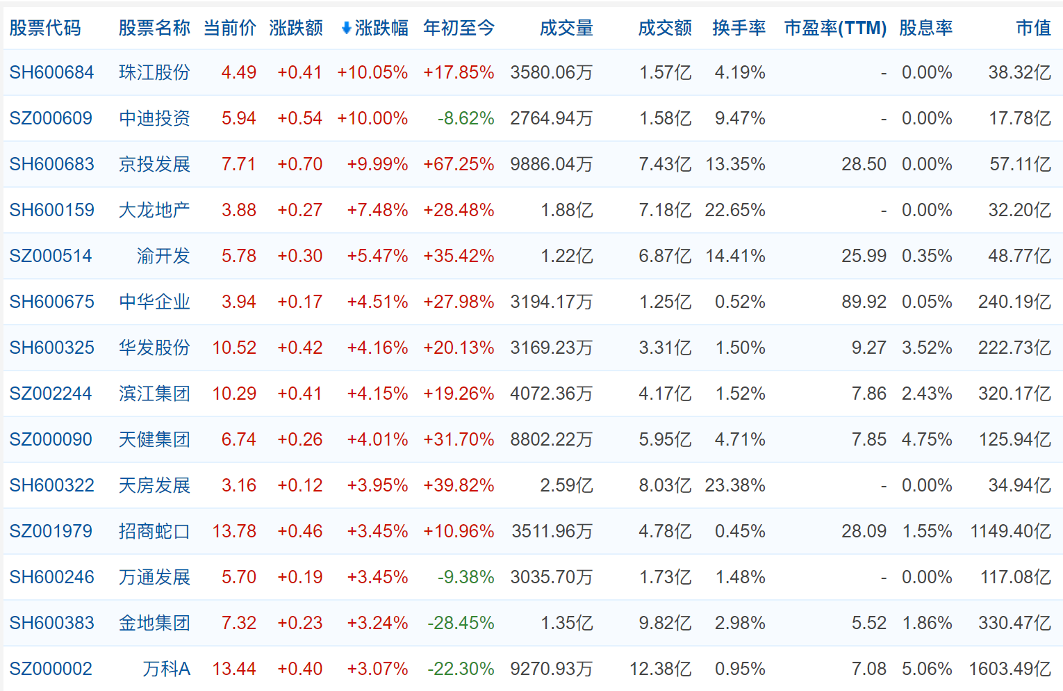 其中,珠江股份、中迪投资、京投发展涨停,分别上涨10.05%、10.00%、9.99%。大龙地产、渝开发、华发股份、滨江集团、天房发展、招商蛇口等跟涨。