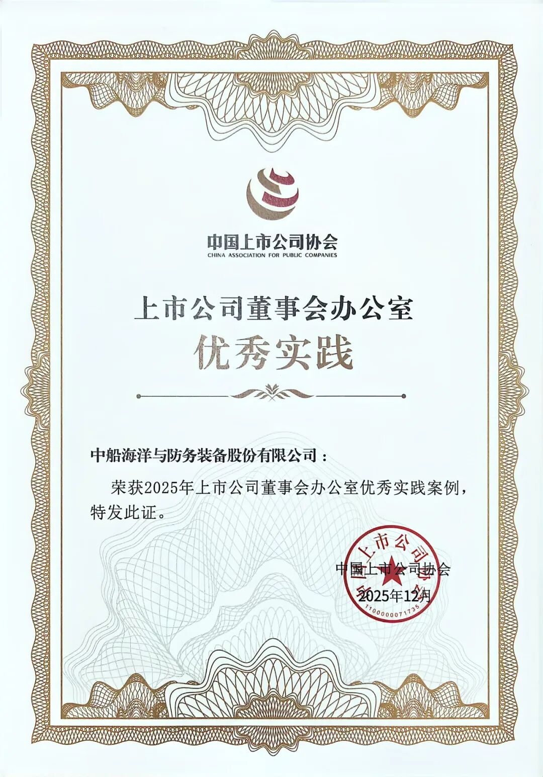 近日,中国上市公司协会多项年度评选结果揭晓,中船防务荣获“2025年度上市公司董事会办公室优秀实践案例”“上市公司年报业绩说明会最佳实践”,中船防务董事会秘书李志东荣获“2025年上市公司董事会秘书履职评价5A评级”。