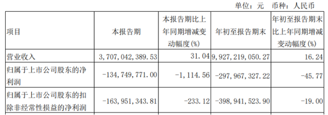 10月28日晚,金龙汽车发布2021年第三季度报称,该季度实现营收37亿元,同比增长31.04%;归属于上市公司股东的净利润为亏损1.3亿元,同比扩大1,114.56%;归属于上市公司股东的扣除非经常性损益的净利润为亏损1.6亿元,同比扩大233.12%。