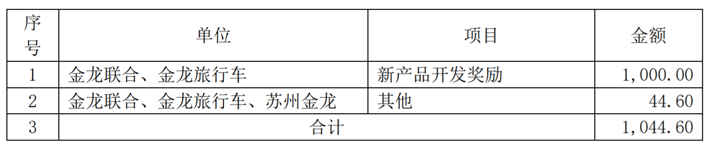 公告显示,金龙汽车下属各子公司厦门金龙联合汽车工业有限公司、厦门金龙旅行车有限公司、和金龙联合汽车工业(苏州)有限公司于2021年11月27日至12月3日收到政府补助1044.6万元。