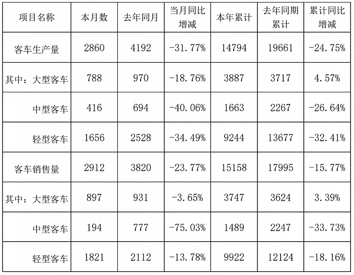 金龙汽车6月7日发布2022年5月份产销数据快报。5月份,客车生产2860辆,较去年同比下降31.77%,本年累计生产14794辆,累计同比下降-24.75%。客车销售2912辆,较去年同比下降-23.77%,本年累计销售15158量,较去年同比下降-15.77%。