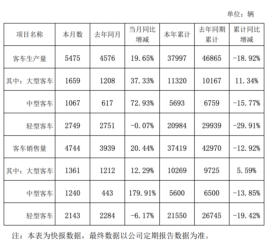 金龙汽车前11月客车销售37419辆,同比下降12.92%