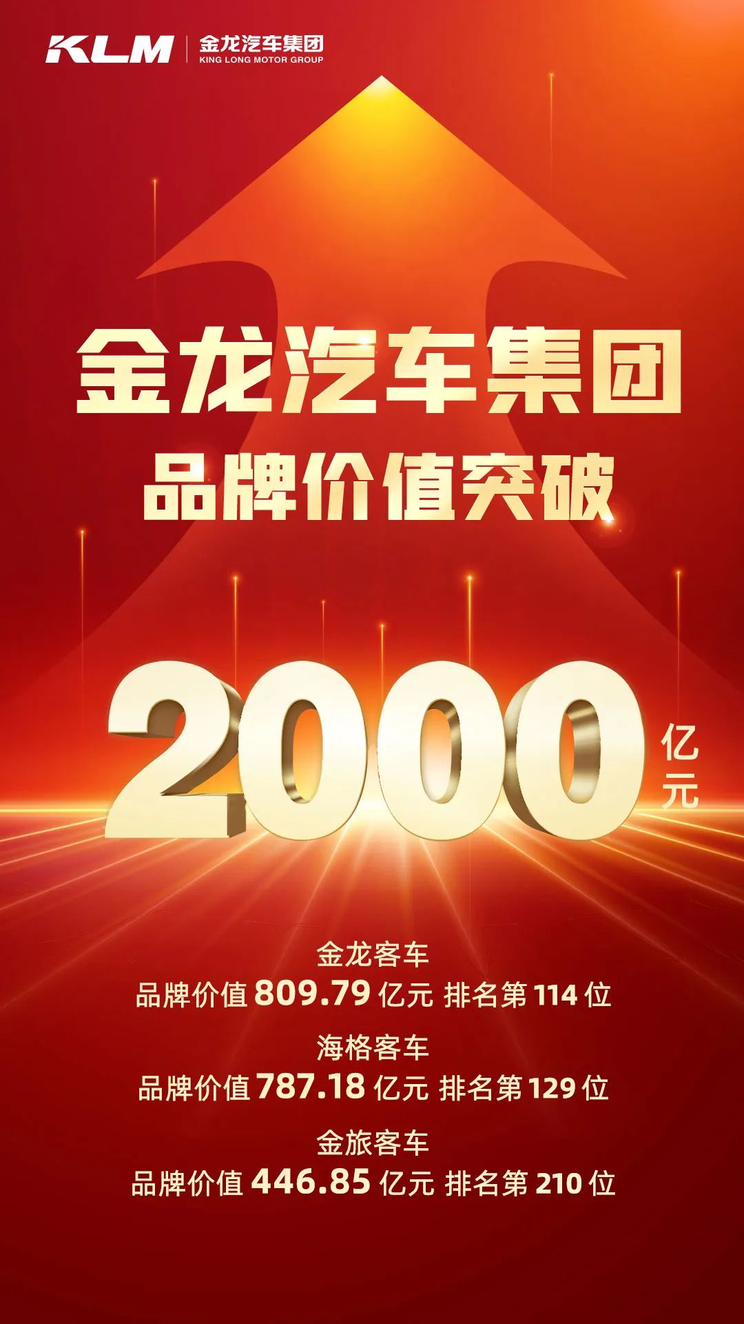 6月15日,由世界品牌实验室(World Brand Lab)主办的第二十届“世界品牌大会”在北京举行,会上发布了2023年《中国500最具价值品牌》分析报告。金龙汽车集团旗下企业再次光荣上榜,其中金龙客车以809.79亿元排名第114位,海格客车以787.18亿元排名129位,金旅客车以446.85亿元排名210位,三龙品牌价值累计突破2000亿元,相比较2022年品牌价值提升307.9亿元,再度彰显了金龙汽车集团卓越的品牌实力。