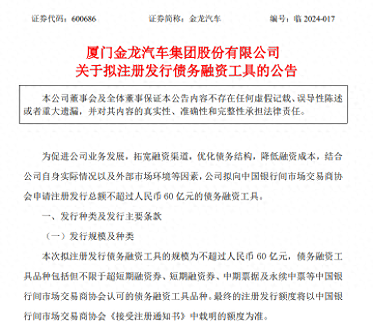 公告显示,金龙汽车拟向中国银行间市场交易商协会申请注册发行总额不超过人民币60亿元的债务融资工具,品种包括但不限于超短期融资券、短期融资券、中期票据及永续中票等。