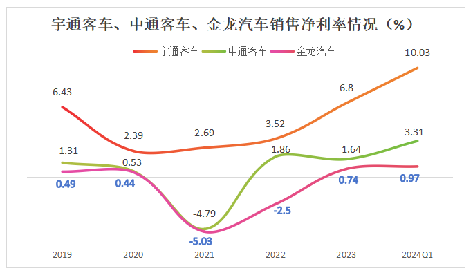 反映在净利率上就是非常差的数据,常年超不过1%,2024年一季度,宇通客车净利率已达10.03%,中通客车净利润3.31%,而金龙汽车净利率仅有0.97%。