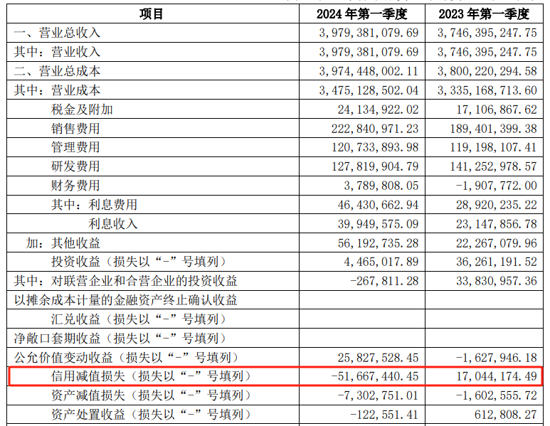 细看金龙汽车一季度的财务报表,可以发现信用减值损失的计提情况,去年一季度信用减值为增加1700万,而今年一季度则为减值5100万。