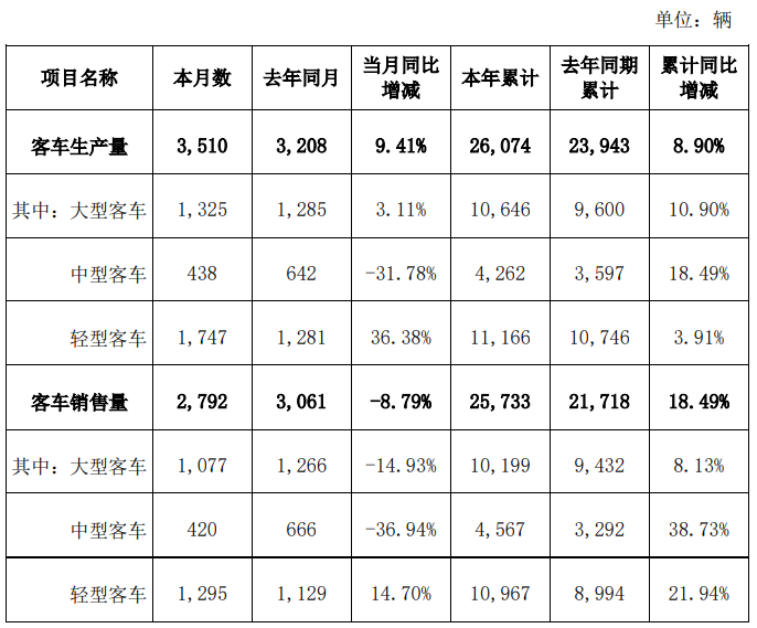 金龙汽车8月6日公告,2024年7月公司客车销售量为2792辆,同比下降8.79%。其中,大型客车销售量为1077辆,同比下降14.93%;中型客车销售量为420辆,同比下降36.94%;轻型客车销售量为1295辆,同比上升14.70%。1-7月公司客车销售量为25733辆,同比上升18.49%。