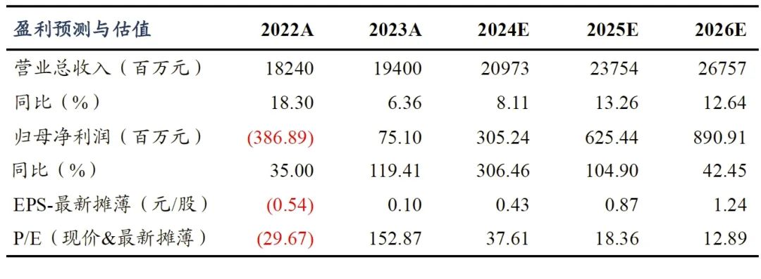 我们维持公司2024-2026年营业收入为210/238/268亿元,同比+8%/+13%/+13%,维持2024-2026年归母净利润为3.1/6.3/8.9亿元,同比+306%/+105%/+42%,对应PE为38/18/13倍。维持公司“买入”评级。