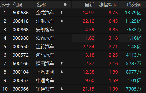 9月6日,汽车股震荡拉升,截至9时48分,金龙汽车逼近涨停,江淮汽车涨超6%,安凯客车、海马汽车、江铃汽车等跟涨。