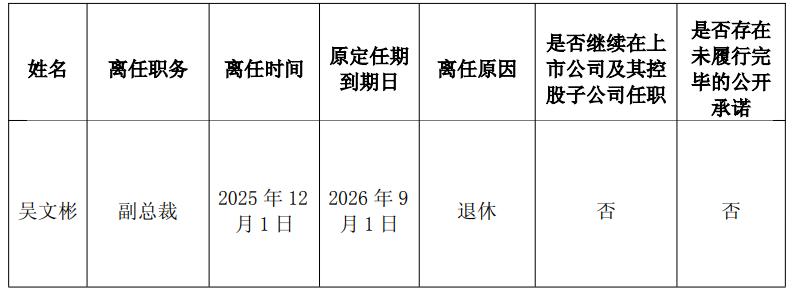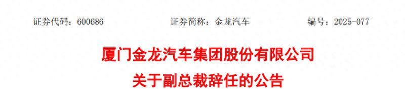 公告显示,厦门 金龙汽车 集团股份有限公司董事会近日收到副总裁吴文彬的辞任函。吴文彬于2025年12月1日辞任副总裁一职,其原定任期到期日为2026年9月1日,辞任原因为退休,辞任后不再继续在上市公司及其控股子公司任职,也不存在未履行完毕的公开承诺。